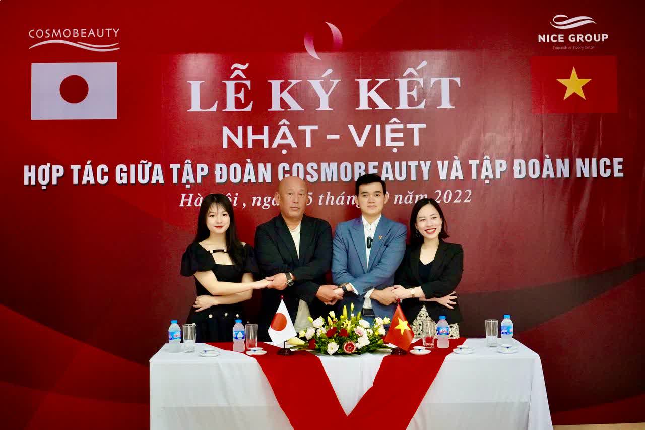 Ở giữa là ngài Shinya Tanaka đại diện tập đoàn dược mỹ phẩm Nhật Bản. Phía Nice Group: bên trái ngài là CEO Phan Thị Mai Anh, bên phải ngài là ông Nguyễn Văn Tiến giám đốc đào tạo.